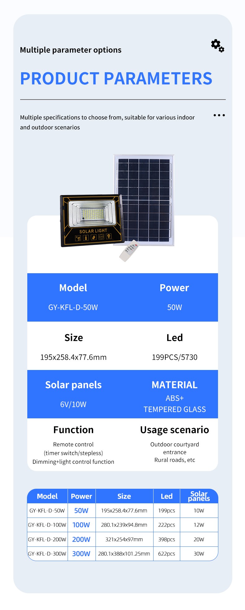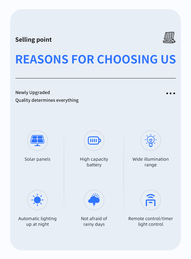 Main Products:Rechargeable Flood Light,Solar Flood Light,Solar Street Light,LED Work Light,Solar Garden Light